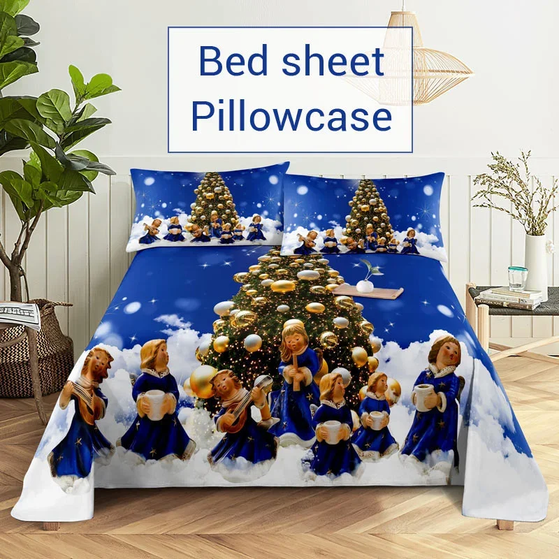 3D HD Christmas Bed Sheets Set Blue Pillow Case Cover Bedding Linen Pillowcase Home Decoration Blue For Single Double Twin King